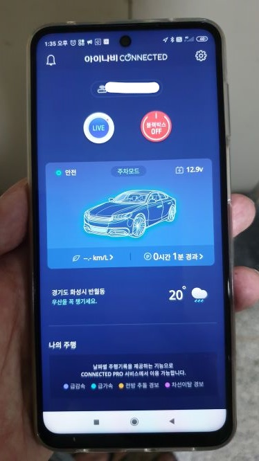 아이나비 커넥티드 앱을 스마트폰에 설치하고 로그인하면 위와 같이 등록할 수 있는 메뉴가 나타납니다. 블랙박스 등록 버튼을 누르면 유심칩에 기재된 전화번호(?)를 입력해 등록을 진행할 수 있습니다. 등록 절차는 스마트 폰에서 요청하고 블랙박스 디스플레이에서 확인하는 블루투스 같은 프로세스입니다.